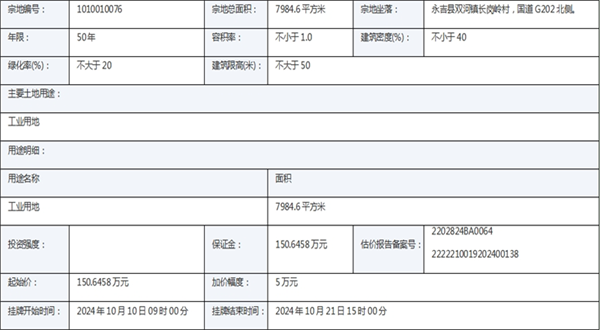 经永吉县人民政府批准,永吉县双河镇长岗岭村村民委员会决定以挂牌出让方式出让1(幅)地块的农村集体经营性建设用地使用权。现将有关事项公告如下: 一、挂牌出让地块的基本情况和规划指标要求: 二、中华人民共和国境内外的法人、自然人和其他组织均可申请参加,申请人可以单独申请,也可以联合申请。申请人一经报名即视为对挂牌文件及地块现状无异议并全部接受,并相应承担法律责任。 三、本次集体土地使用权挂牌出让按照价高者得原则确定竞得人。 四、本次挂牌出让的详细资料和具体要求,见挂牌出让文件,以挂牌出让文件为准。申请人可于2024年9月20日至2024年10月20日到永吉县政务服务中心203室获取挂牌出让文件。 五、申请人可于2024年9月20日至2024年10月20日到永吉县政务服务中心203室向我局提交宗地现状条件知情书和书面申请。交纳竞买保证金的截止时间为2024年10月20日15时00分。经审核,申请人按规定交纳竞买保证金,具备申请条件的,我局将在2024年10月20日16时00分前确认其竞买资格。 六、本次农村集体经营性建设用地使用权挂牌活动在永吉县政务服务中心5楼小标室进行。各地块挂牌时间分别为: 1010010076号地块:2024年10月10日09时00分至2024年10月21日15时00分。 七、其他需要公告的事项: 供地状况说明:现状条件出让 八、联系方式与银行账户: 联系地址:永吉县政务服务中心203室 联 系 人:甄光宇 联系电话:15981134562 开户单位:永吉县双河镇综合服务中心 开户银行:吉林永吉农村商业银行股份有限公司双河支行 开户账号:0720109011015200001259