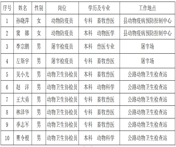 按照《永吉县农业农村局开展特聘动物防疫专员工作实施方案》,我局于10月中旬在政府网站、电视台进行了招聘公告,12月初对存在竞聘的人员进行了面试,拟确定13名人员入围特聘动物防疫专员岗位,12月中旬组织统一体检,最终有10名人员正式被录取为特聘动物防疫专员,其中动物防疫员2人,屠宰检疫员2人,动物卫生协检员6人。现将第一批聘用人员名单公示如下: 鉴于原定招聘15名动物防疫专员,目前动物卫生协检员尚有5个岗位空缺,现开始补招,具体岗位要求,见2020年10月19日《永吉县农业农村局公开招募特聘动物防疫专员的公告》。补招工作从此公告之日起五个工作日结束,五个工作日内按报名先后顺序,额满为止。报名期满仍有岗位空缺的,择优扩招1名女生,要求25周岁以下,畜牧兽医相关专业,从事动物卫生协检员的人事管理工作。第一批未被录取的人员不在补招范围内。 |
